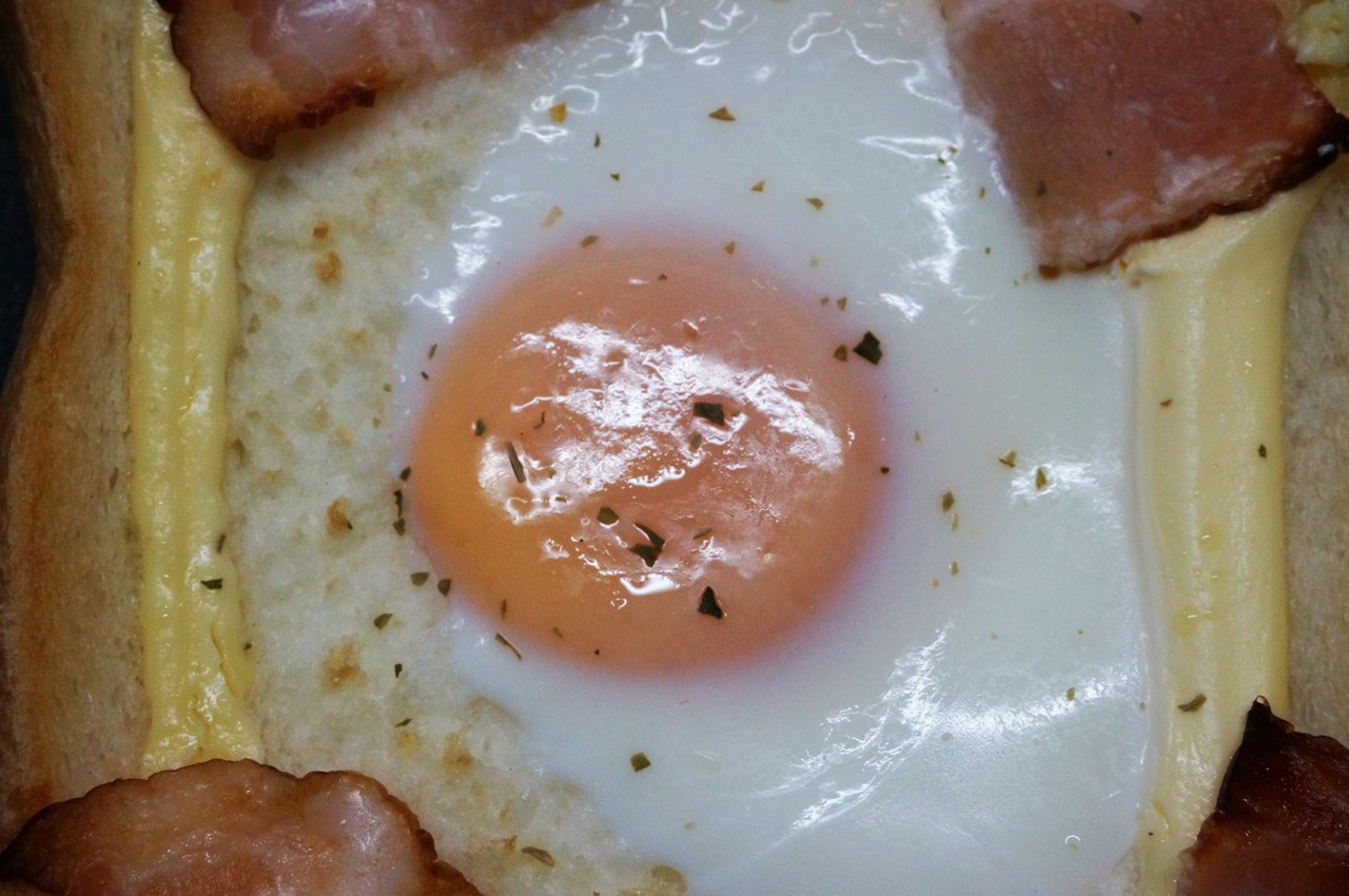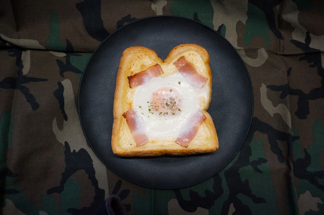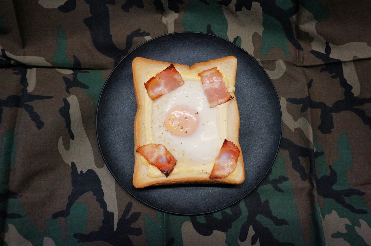 まず、トースト1枚を用意し、表面上にマヨネーズを一周させ、ハーフベーコン1枚を4等分し四隅に並べ、小玉子1個の目玉焼きを真ん中にドーンと置いて、オーブントースターで焼き上げる。そんな感じのオープンサンドのことを指すのだと思います。