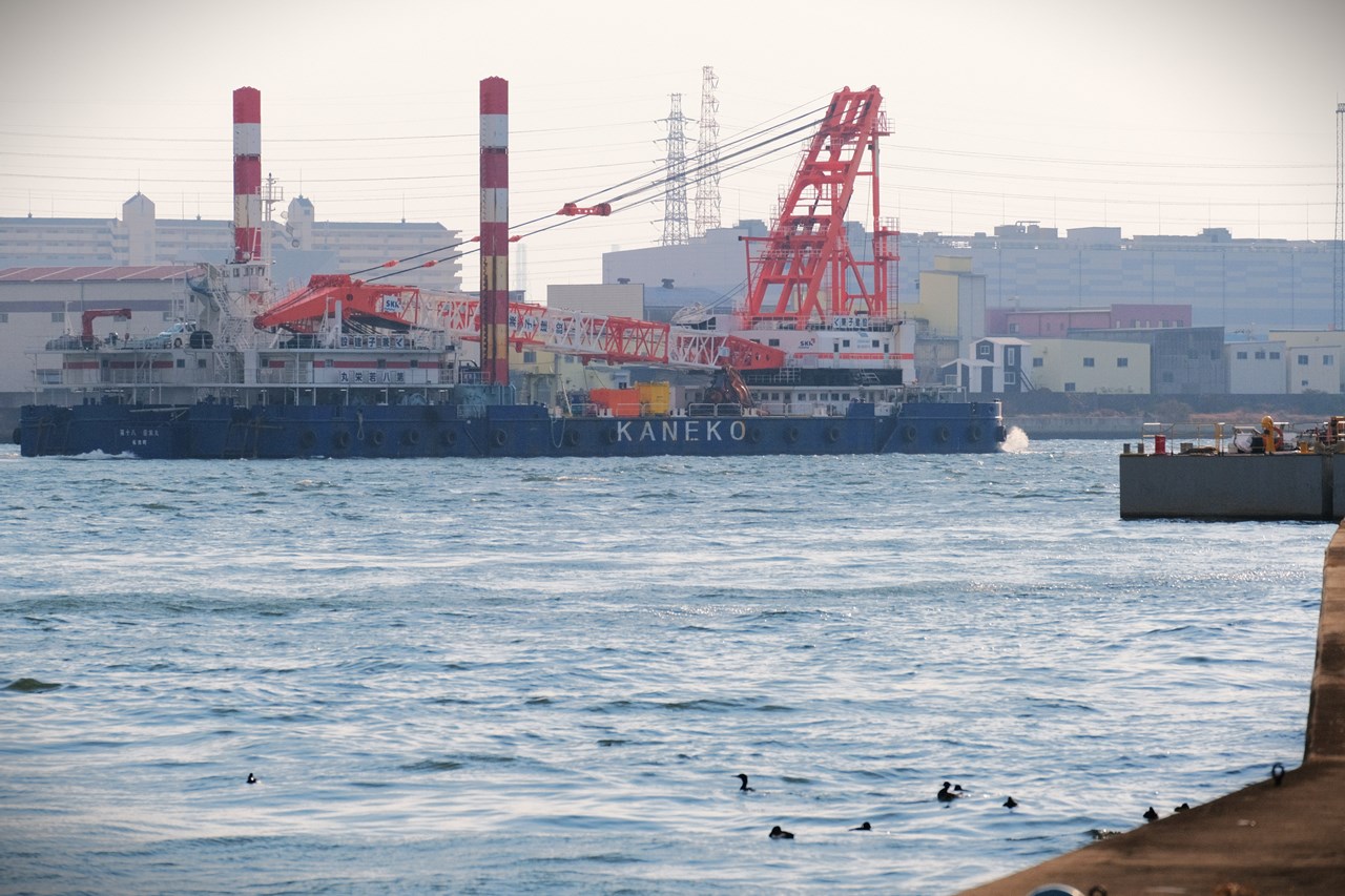 今までに見たことのないような、超巨大なクレーンを搭載した起重機船ですよね!海洋土木建設工事に活躍する船舶なのでしょうね…。